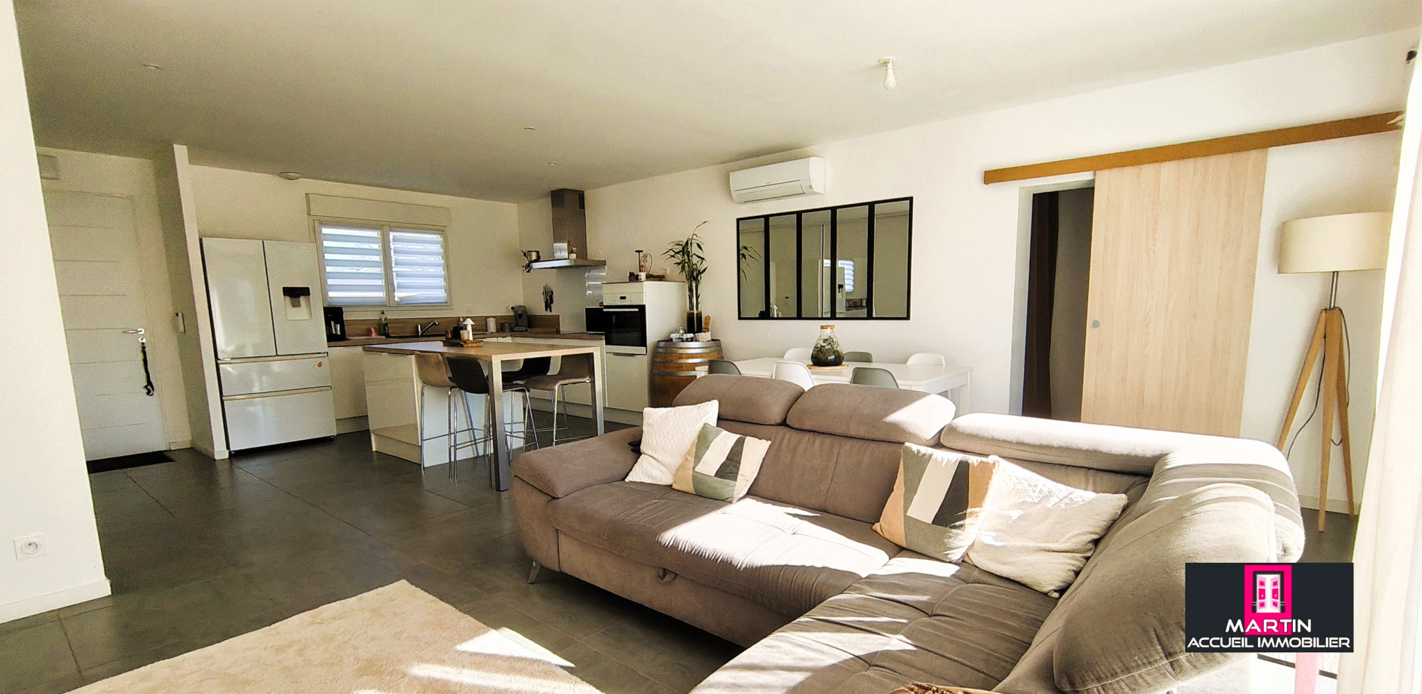 La maison s'articule autour d'une vaste pièce de vie de 45m² exposée Sud-Est, largement ouverte sur l'extérieur. La cuisine américaine, entièrement équipée et intégrée à cet espace, favorise la convivialité.